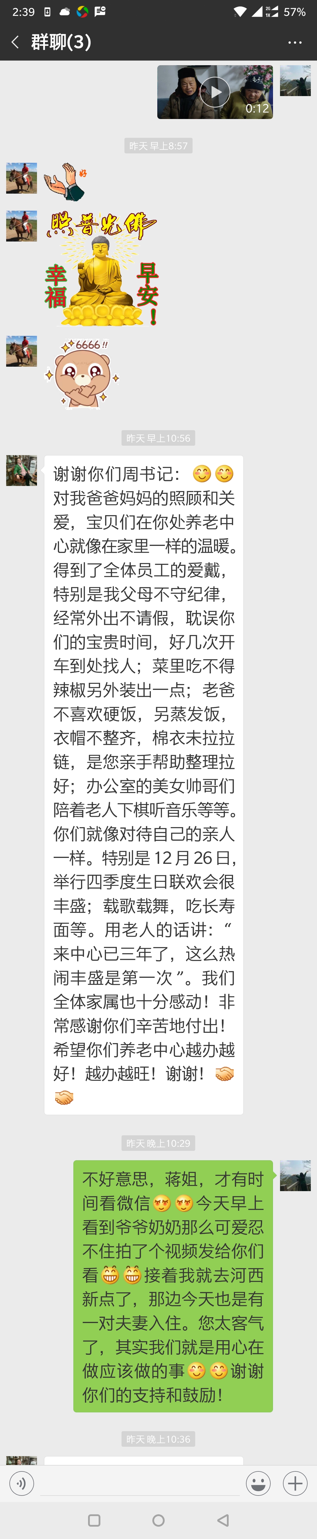 Ҏ(gu)爸爸妈妈的照֒关爱Q宝贝们在你处养老中心就像在安一L(fng)温暖。得C全体员工的爱_特别是我父母不守U律Q经常外Z请假Q耽误你们的宝贉|_好几ơ开车到处找人,菜里吃不得G椒另外装Z点,老爸不喜Ƣ硬饭,另蒸发饭Q衣帽不整齐Q棉未拉拉链,是?zhn)亲手帮助整理拉好Q办公室的美奛_哥们陪着老h下棋听音乐等{。你们就像对待自q亲h一栗特别是12?6日D行四季度生日联欢会很丰盛Q蝲歌蝲舞,吃长寉K{。用老h的话讜y来中心已三q了Q这么热闹丰盛是W一ơ”。我们全体家属也十分感动Q非常感谢你们辛苦地付出Q希望你们养老中心越办越好!办旺Q谢谢!