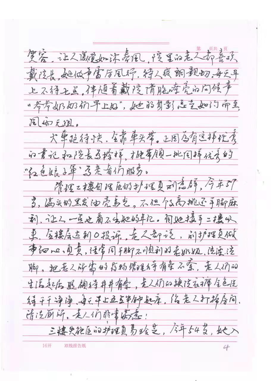 理二楼自理区的护理员刘意群Q今q?/span>57岁,满头的黑发a(b)亮乌光,不仅个子高挑(xi)q手脚麻利,让h一点也看不出她的年U。自Ҏ(gu)手二g来,全楼层达?/span>0投诉Q老h都说刘姨做事认真l心(j)负责Q经常同手脚不顺利的老奶奶洗澡洗脚,把老h所需的药物管理的有条不紊Q老h们的生活起居照顾的井井有条,老h们的换洗裤全都z得q干净净Q每天早上五点半钟v床,l老h打扫戉K、清z厕所Q老h们非常满意!