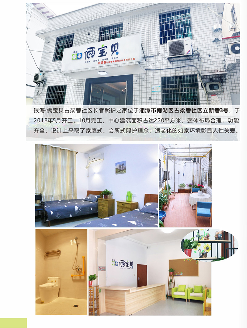 銀?!z寶貝古梁巷社區(qū)長者照護之家位于湘潭市雨湖區(qū)古梁巷社區(qū)立新巷3號,于20185月開工,10月完工,中心建筑面積占達220平方米,整體布局合理,功能齊全,設(shè)計上采取了家庭式、會所式照護理念,適老化的如家環(huán)境彰顯人性關(guān)愛。