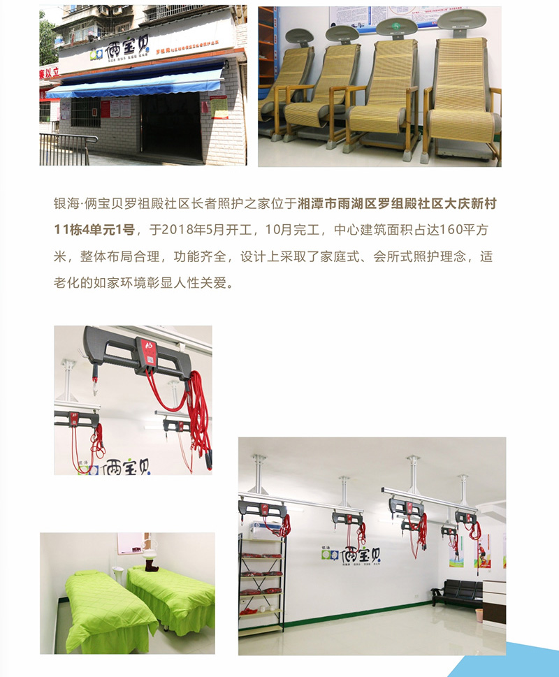 銀?!z寶貝羅祖殿社區(qū)長者照護(hù)之家位于湘潭市雨湖區(qū)羅組殿社區(qū)大慶新村114單元1號,于20185月開工,10月完工,中心建筑面積占達(dá)160平方米,整體布局合理,功能齊全,設(shè)計上采取了家庭式、會所式照護(hù)理念,適老化的如家環(huán)境彰顯人性關(guān)愛。