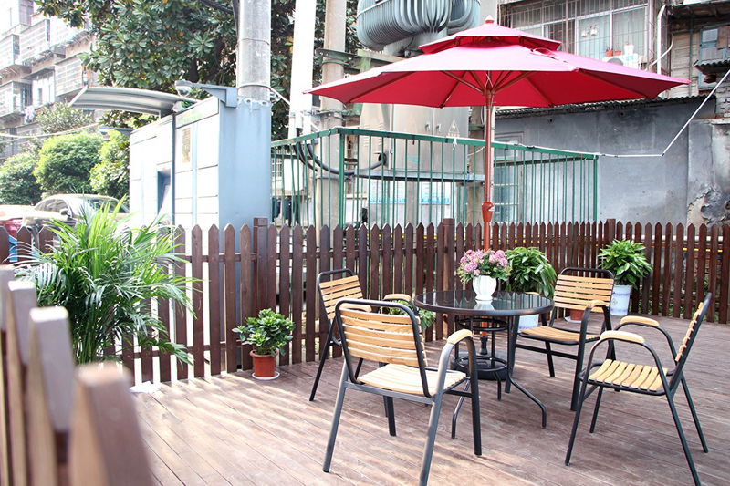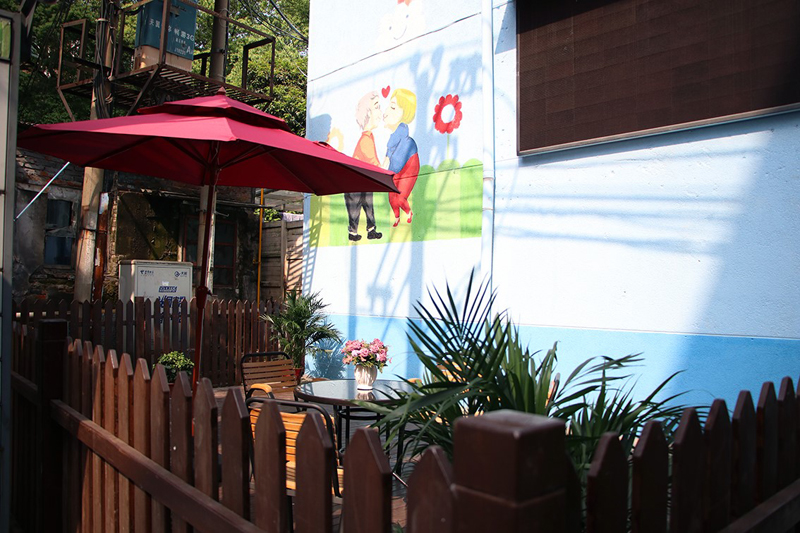 外墻設計以明度適中的天空藍為主色調,室外活動場地進行全面提質改造,設戶外花園約50平方米,布置綠化,安置桌椅、遮陽傘,保證老人戶外活動的需求,為老人提供私密、安全的用來休息交談或澆花養(yǎng)草的休閑場所。