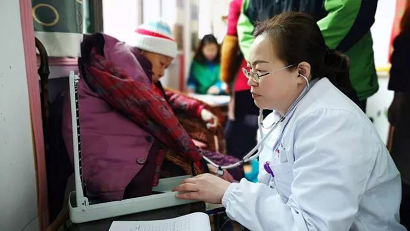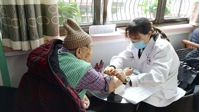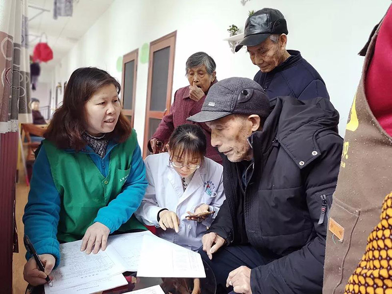 一邊耐心細致地為每一位老人進行量血壓、稱體重、抽血、尿檢、B超、心電圖等各項檢測。