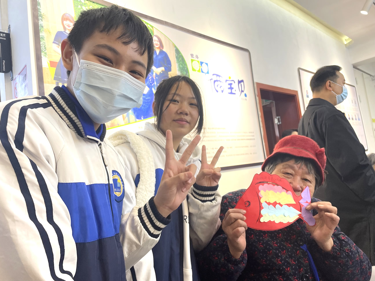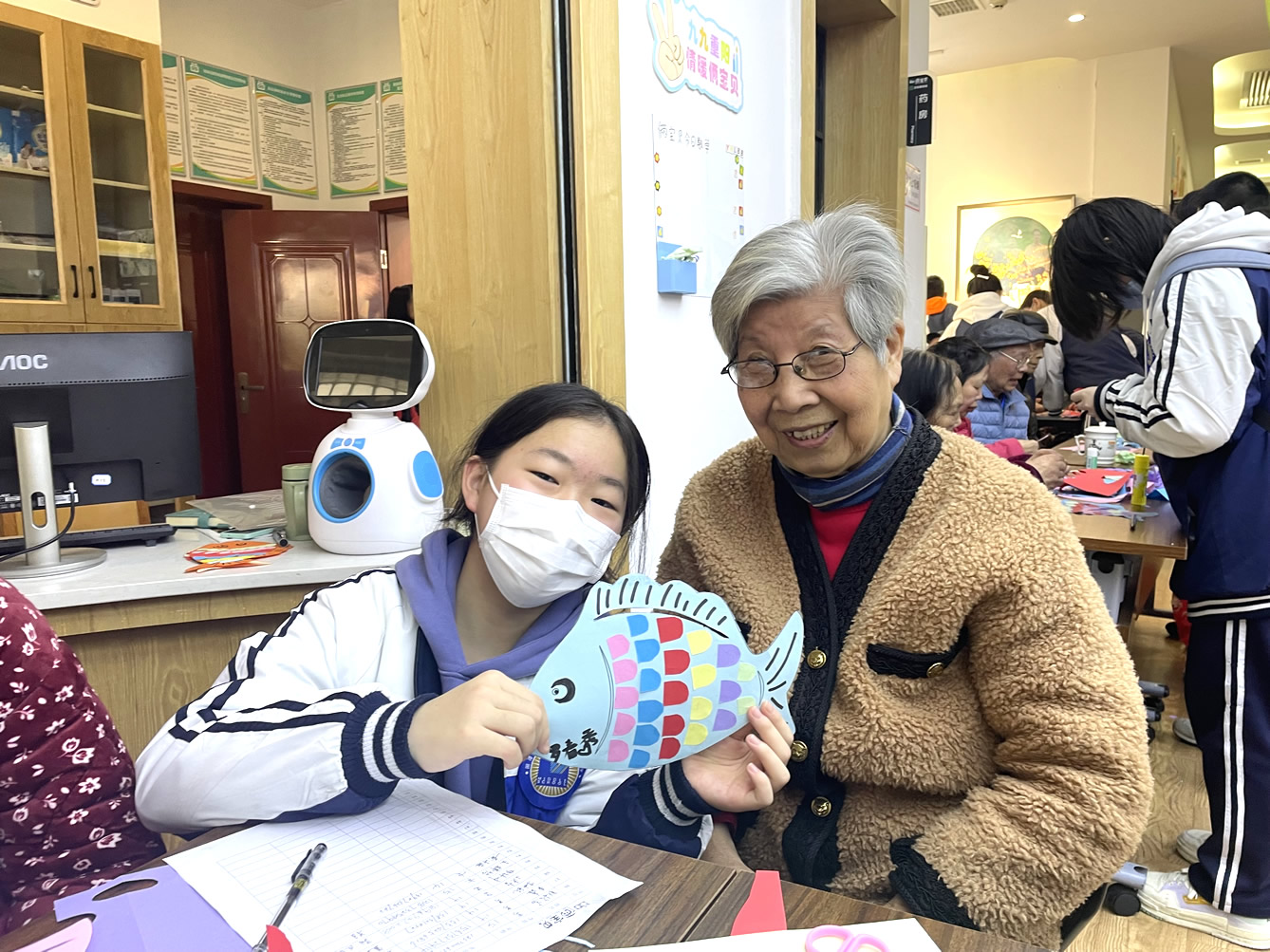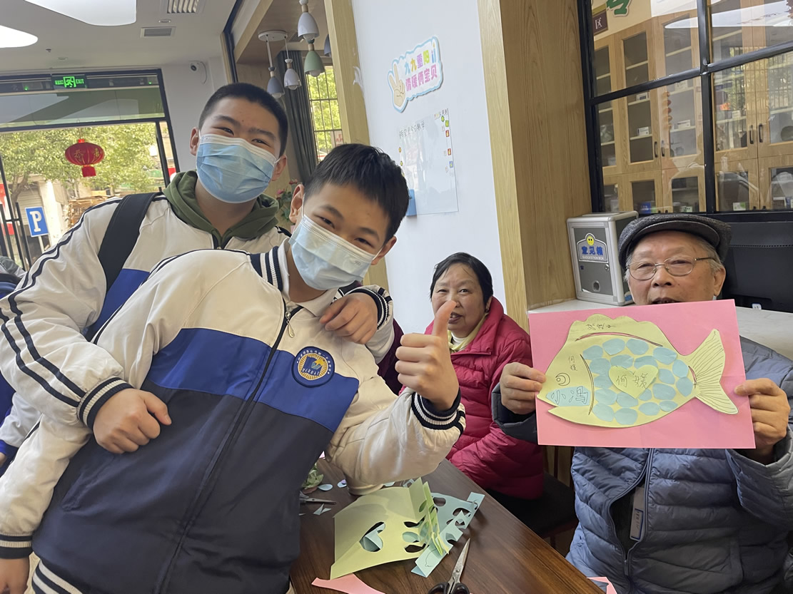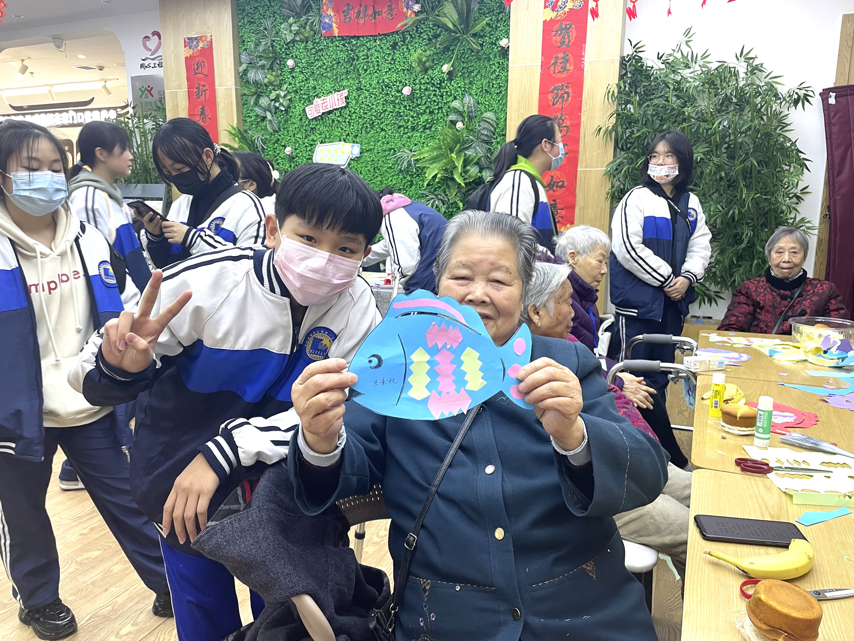 “爺爺奶奶們好!”還未瞧見(jiàn)人一聲聲清脆響亮的問(wèn)好聲便已傳了進(jìn)來(lái),在老師及工作人員的組織下同學(xué)們有序進(jìn)入到院內(nèi)并配合做好疫情防控登記。不一會(huì)兒,同學(xué)們陸續(xù)找到爺爺奶奶進(jìn)行自我介紹,并以一對(duì)一的形式來(lái)協(xié)助他們完成今天的手工作品“年年有魚”。