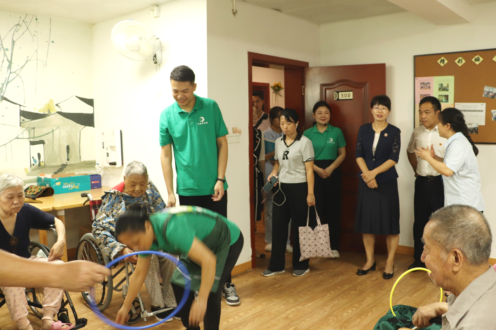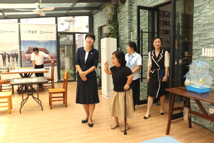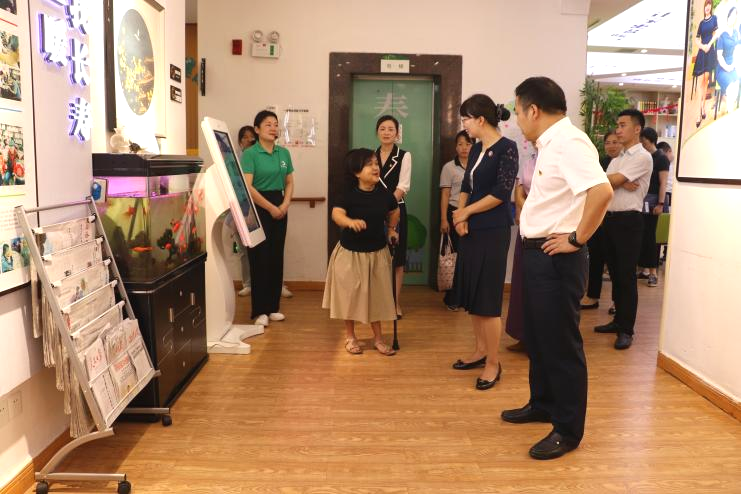 董事長(zhǎng)王朝暉女士帶領(lǐng)導(dǎo)一行先后參觀了銀海倆寶貝窯灣康養(yǎng)中心的藥房、文化墻、多功能活動(dòng)室、各類助老設(shè)施、護(hù)士站、綜合養(yǎng)老服務(wù)平臺(tái)、年齡博物館、陽光花房等地。
