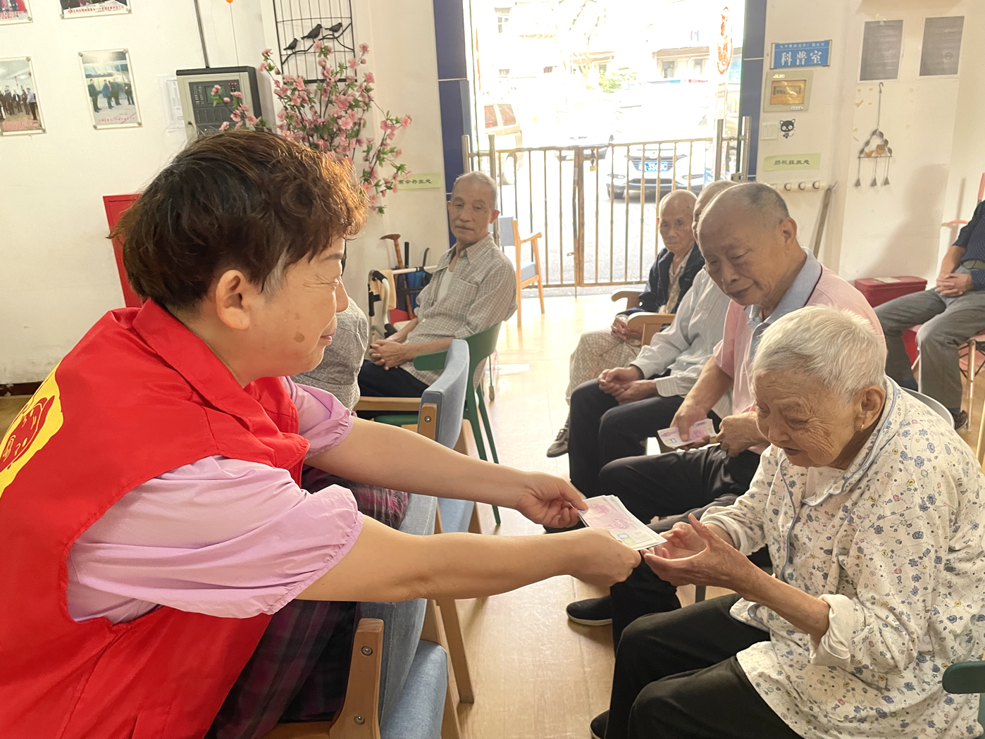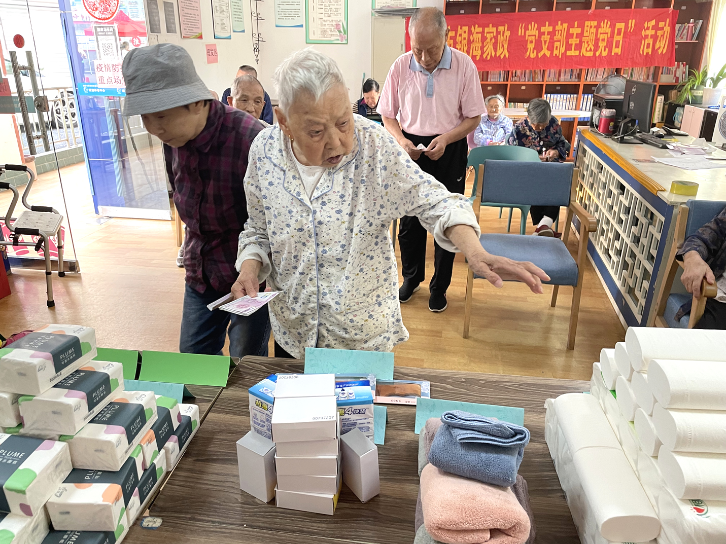 長者們日常的活動有:擇菜、澆花、養(yǎng)魚、遛鳥、還有各類康樂活動、康復訓練等等,他們在收獲健康、快樂、成就感的同時,也賺到了不少的工資——幸福幣。每個季度開放一次的幸福銀行兌換日里,爺爺奶奶則可以用自己的“工資”開啟隨心購模式,爺爺奶奶們可以用掙到的幸福幣直接在院內購買生活用品。