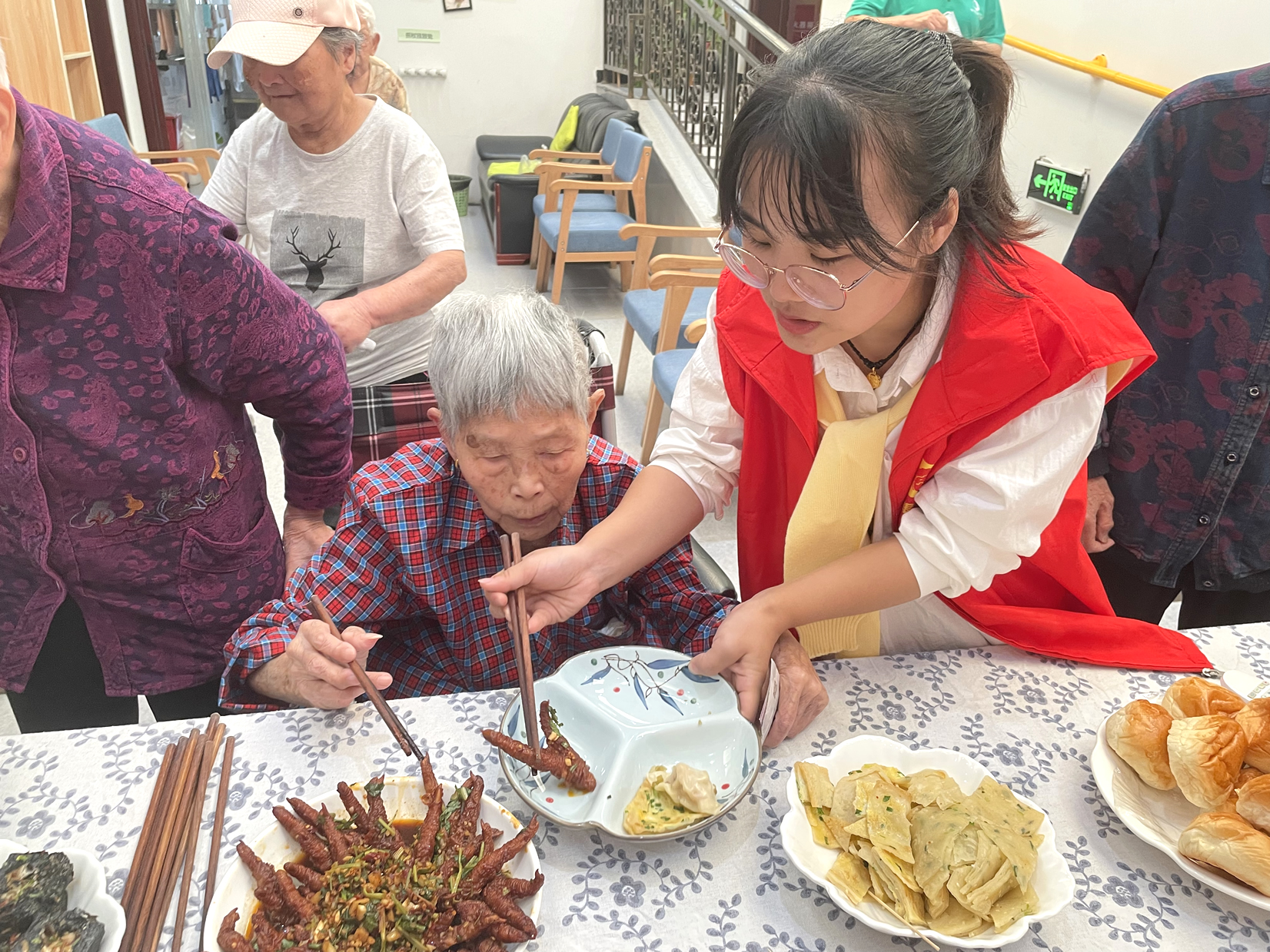 現(xiàn)場食物十分豐富,有重陽花糕臭干子、虎皮爪小籠包、餛飩、蒸餃、涼面、炒粉、蒸玉米、紫薯、油條、涼拌菜、水果拼盤等美食陸續(xù)端上來,格外美味的各種小吃,種類繁多,色香味俱全。爺爺奶奶們每天吃食堂的飯菜,時不時換點新花樣,都很高興,想吃什么,用手上的幸福幣直接購買就行。爺爺奶奶們一邊感受著自己賺錢自己花的快樂一邊品嘗著喜歡的小食,整個現(xiàn)場其樂融融、熱熱鬧鬧。行動不便的爺爺奶奶們也沒關系,工作人員送到身邊隨他挑選。