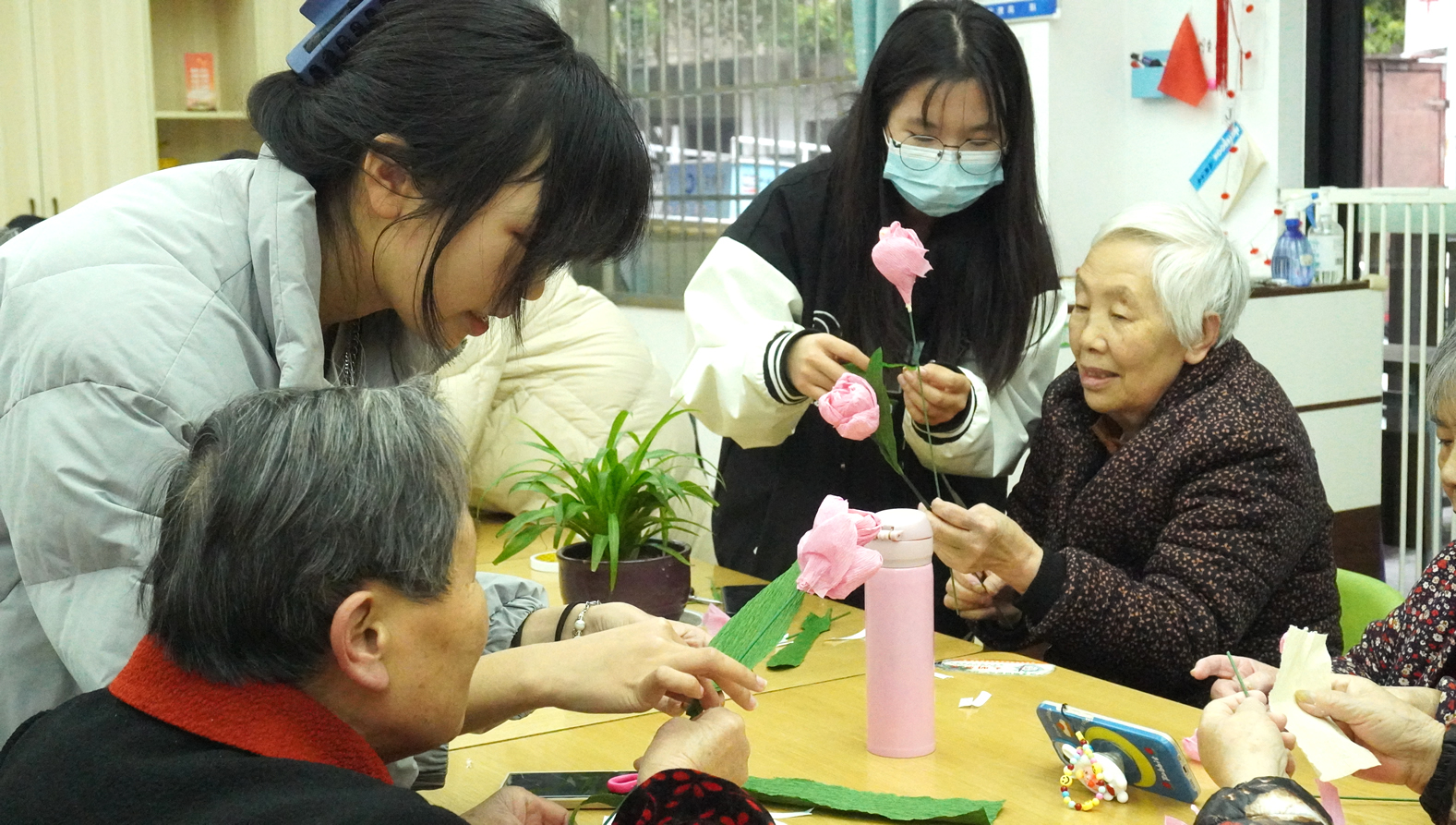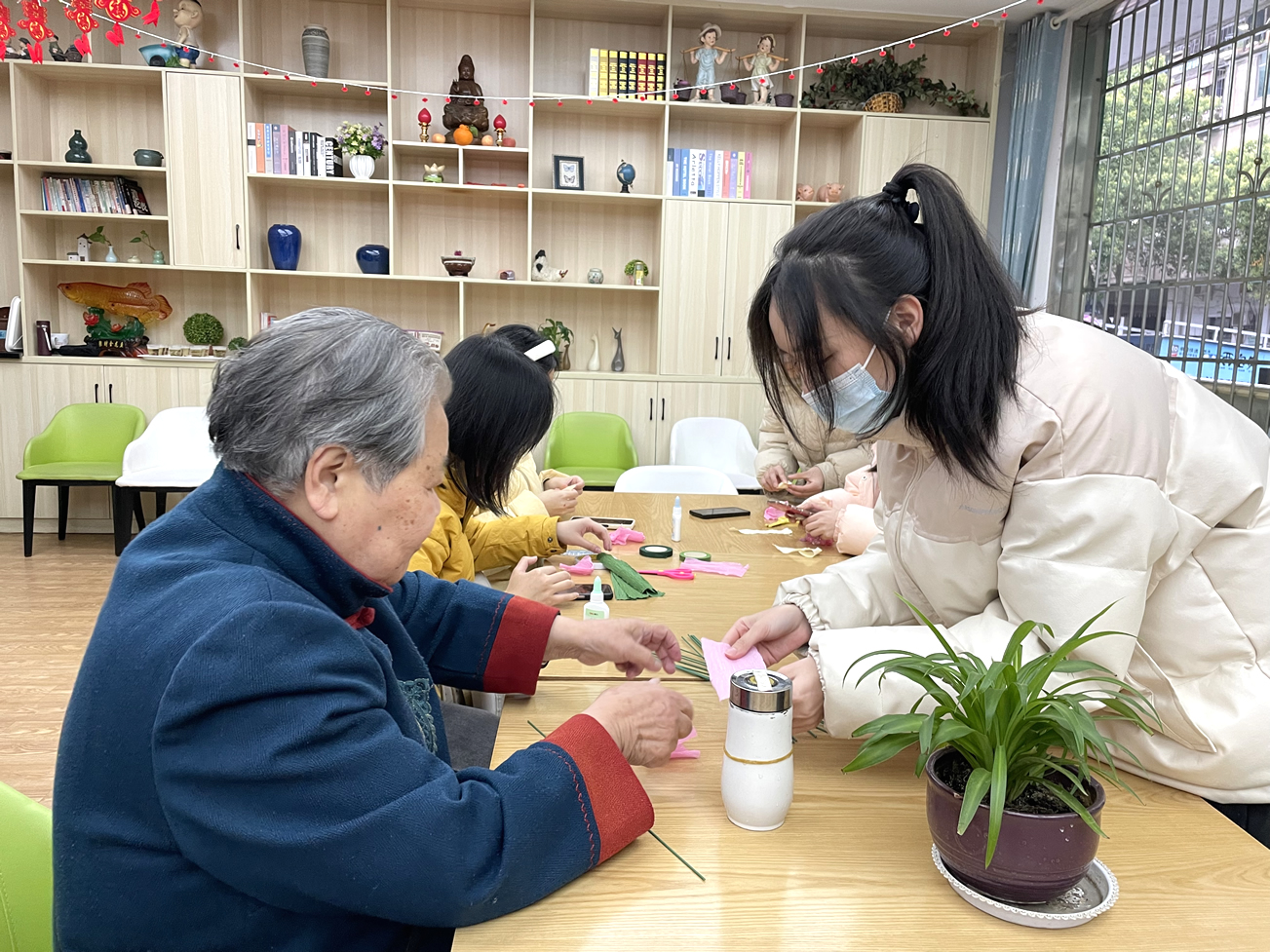 手工活動(dòng)不僅能激發(fā)老人的創(chuàng)造力,還能培養(yǎng)老人的動(dòng)手能力,不如我們一起動(dòng)手做一束永不凋落、漂亮的郁金香吧!伴隨著志愿者小姐姐們的熱情鼓勵(lì),爺爺奶奶們?cè)谒齻兊膸椭?,完成了一朵朵鮮艷漂亮的郁金香。