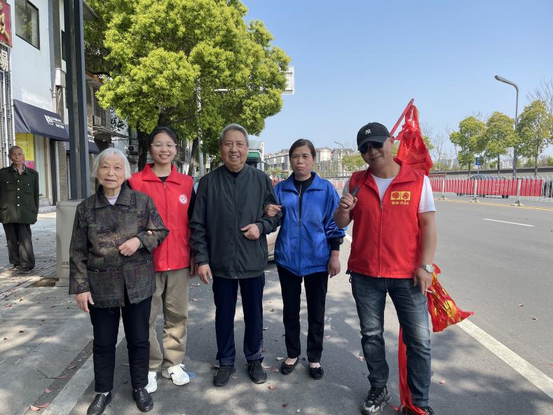 而部分乘坐輪椅不能進(jìn)廟的爺爺奶奶們,則在門口休息片刻,和志愿者們一起體驗(yàn)傳統(tǒng)舞龍彩帶的魅力。