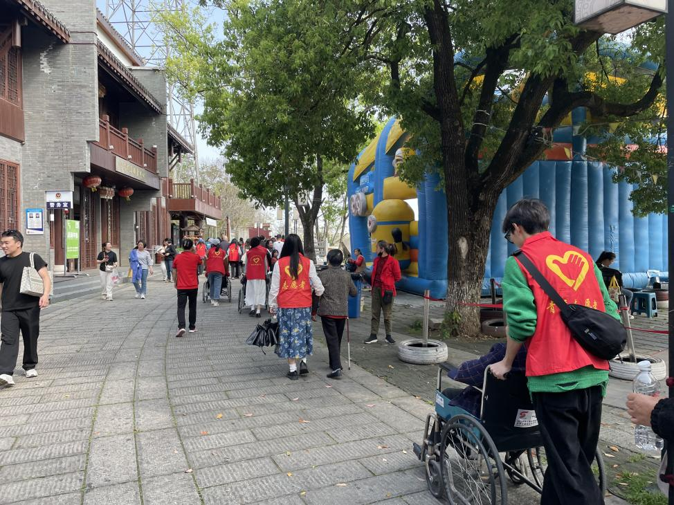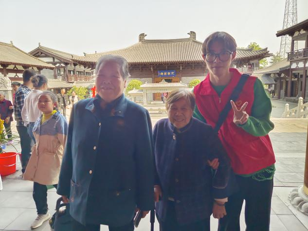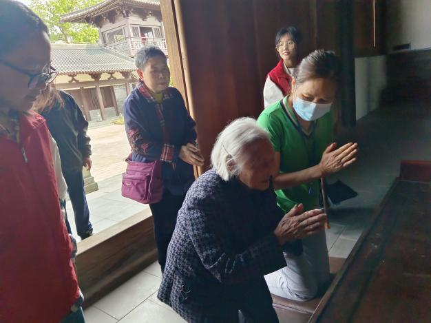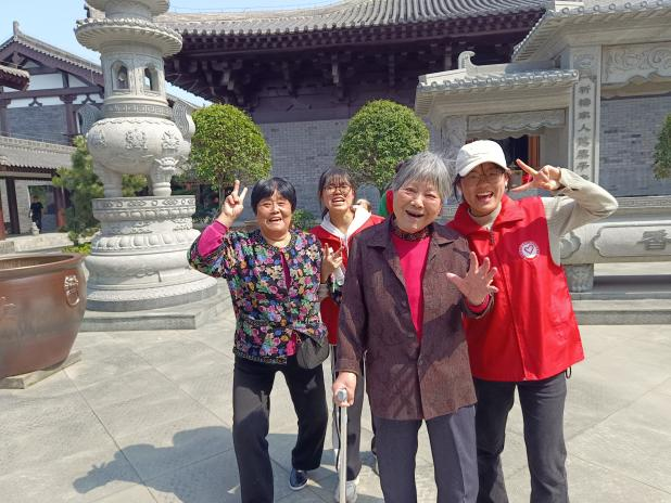 爺爺奶奶在志愿者們的攙扶和幫助下,第一次走進(jìn)寺門,一步步走在青石板面,感受它的文化與傳承。
